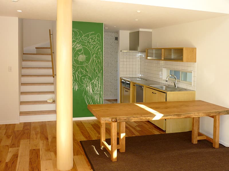優しいトーンでまとめた外観から一歩中に入れば、天然木がふんだんに使われたぬくもり溢れる空間に。玄関土間を広く、ファミリースペース、リビングには黒板までを設け、遊び心をいっぱい詰め込みました。このお家でゆっくり子供の成長を見守っていただけると思います。