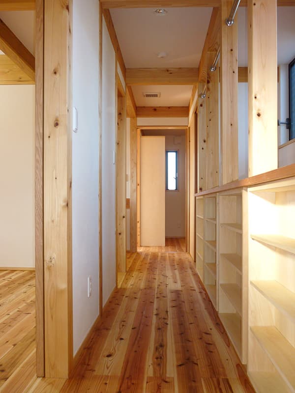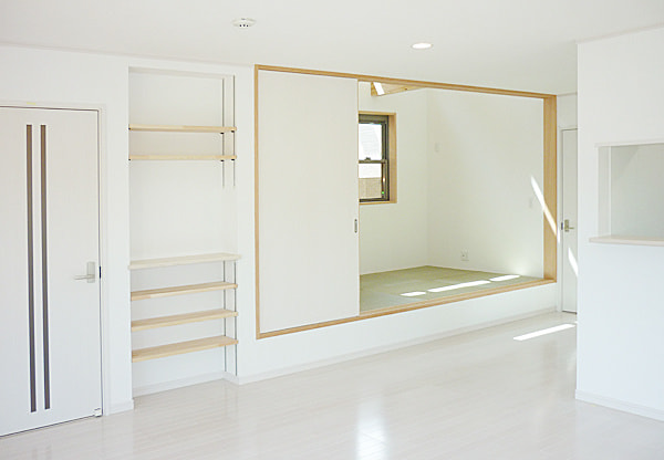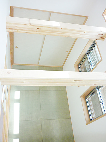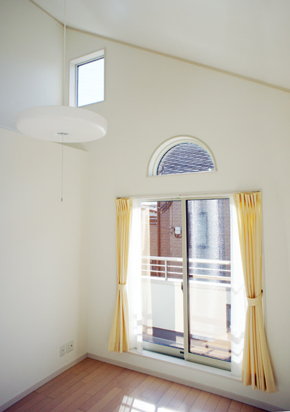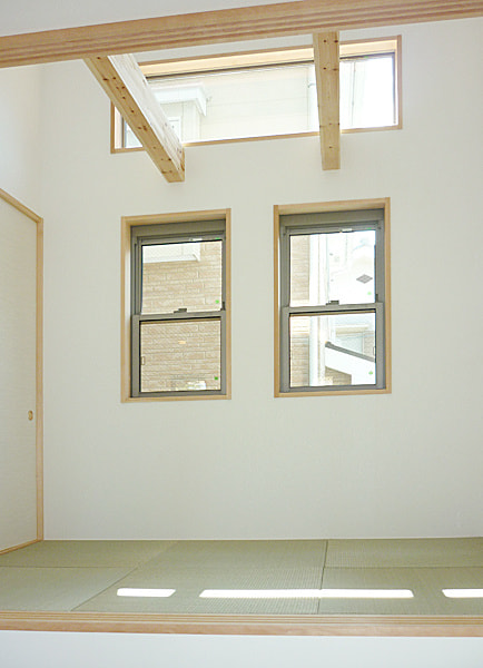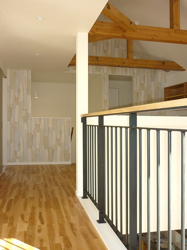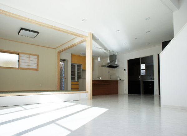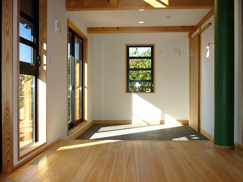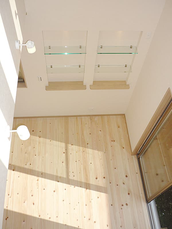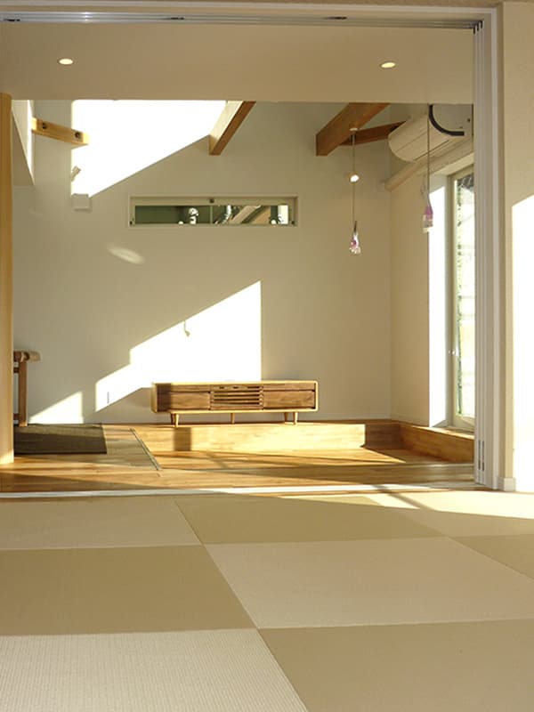 計算された「抜け」感が、陽光の表情を演出。光と風を満喫できる、心地よい空間を実現します。暖かい日差しの元、思わず昼寝をしたくなる家です。