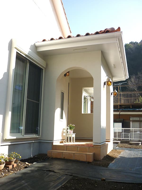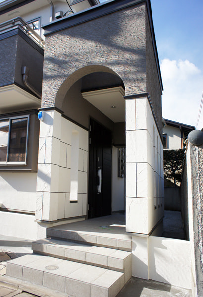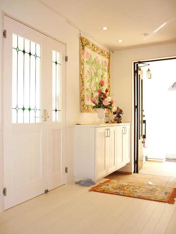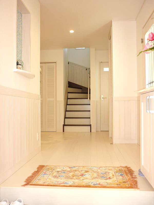 愛らしい曲線を描いたポーチが魅力的で、その先には明るい光の差込む廊下が現われます。そして細部の造りにまでこだわったリビングへと誘込まれます。美しいお家です。
