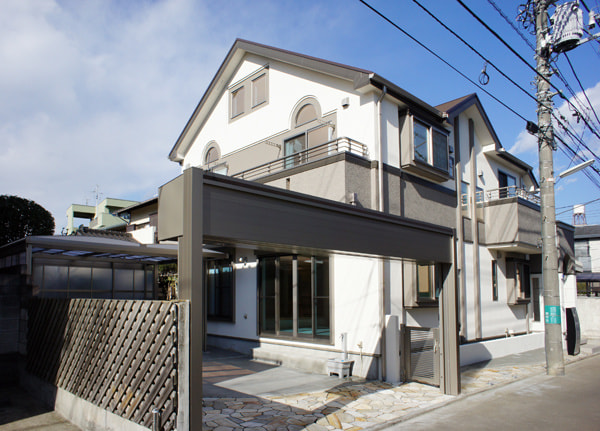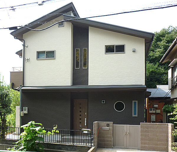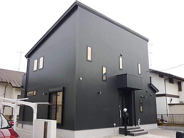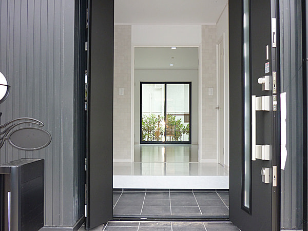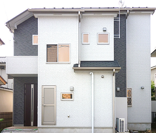 2トーンのコントラストが印象的なファサード。玄関を開けると白を基調とした空間が広がります。畳コーナーから繋がるダイナミックな吹抜けが開放感を高めます。